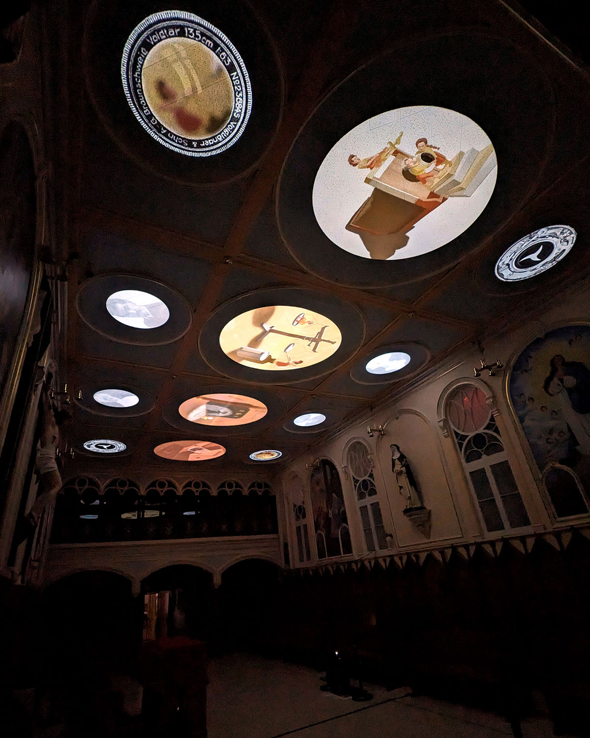 Du nouveau via l’ancien est le fruit d’un projet de recherche et d’exploration du fonds d’archive du Studio B.J. Hébert conservé au Centre d’histoire de Saint-Hyacinthe. Présentée dans la chapelle du monastère des sœurs adoratrices du Précieux-Sang, à Saint-Hyacinthe, cette projection de mapping vidéo est inspirée de son contexte – l’art figuratif de la chapelle. Un collage d’images tirées du fonds B.J. Hébert et d’illustrations inspirées par mes recherches a été projeté sur le plafond de la chapelle sous forme de fresque numérique. Avec cette murale, j’explore des idées entourant les thèmes de la technologie et de la créativité.