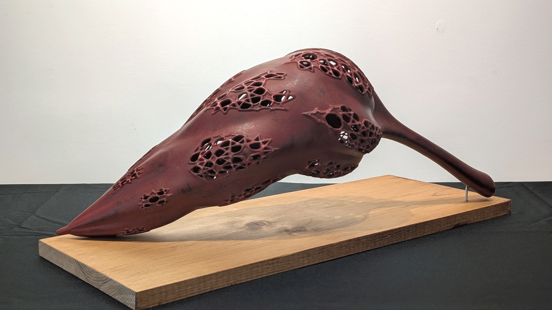 Cette exposition de vitrine présente le fruit de ma résidence de création à La Fabrique, le laboratoire numérique de la Bibliothèque de Saint-Hyacinthe. Un projet soutenu par le programme territoriale du CALQ. La sculpture principale de l’exposition est une impression 3D à grande échelle de 60 cm de long et 30 cm de haut. La sculpture a été divisée en 8 parties et a nécessité plus de 160 heures d’impression. L’inspiration pour cette oeuvre a été la fleur de sumac, une plante porteuse de multiples significations.